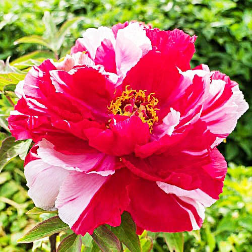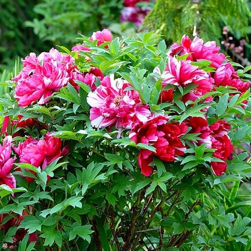 Великолепный пион Као древовидный способен достичь высоты 120-150 см. Его крупные густомахровые соцветия диаметром 20-25 см с желтой сердцевиной поражают удивительными оттенками рубина, пурпура и коралла. Обильно цветет в мае 8-15 дней, окутывая сад легким пряным ароматом.